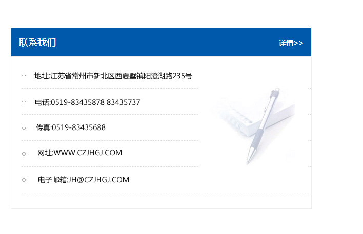 傳真:0519-83435688    郵編:213135    網址:WWW.czjhgj_com.qingshengboli.com    電子郵箱:JH@czjhgj_com.qingshengboli.com